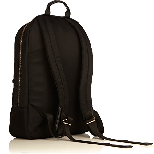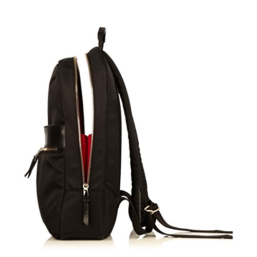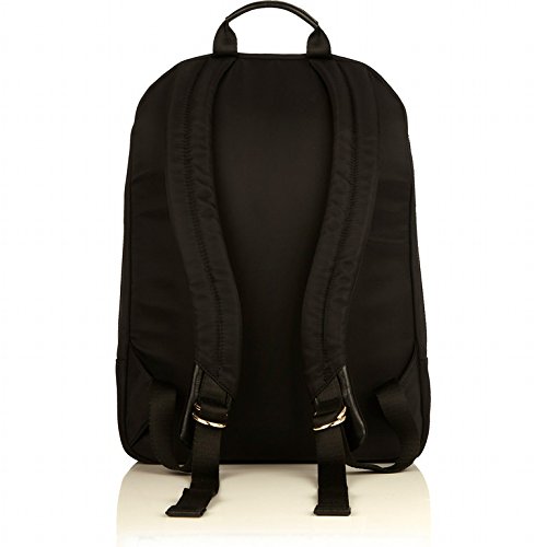 -. Feature : Sleek nylon exterior with saffiano leather trim / Colorful soft lining / Fastens securely with a nylon top zipper / Holds up to a 14-inch laptop within its quilted laptop pouch with shockproof protection / 3.90x11.60x16.54 / Pockets: 2 interior slip, 2 interior zip, 2 exterior