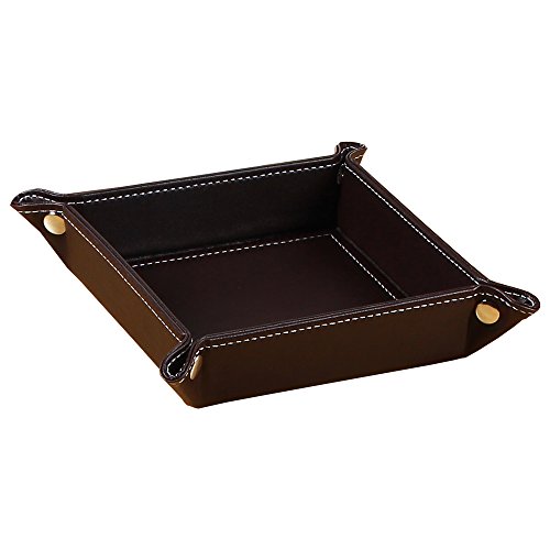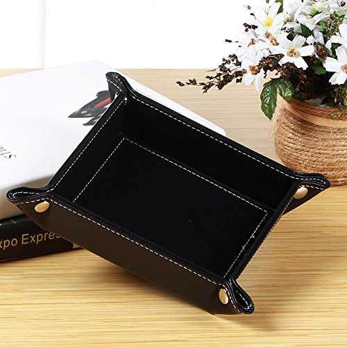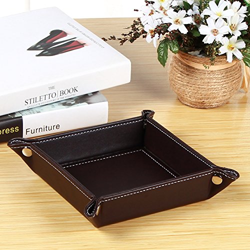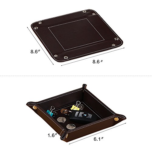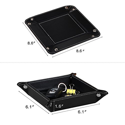 -. Feature : 【Material】Durable leather jewelry tray: covered with delicate PU leather texture, easy to clean, only need wipe gently with wet cloth to restore the bright. / 【Design】Simple and tasteful design,first-grade workmanship, elegant and modern style with rivets on the corners, Simple and generic construction easy to use, easy to carry, with snaps in the 4 corners to make it is easy to fold and unfold. / Use】Fit for your bedroom, dresser, bathroom, living room, and the office, make your space more tidy. Apply for cell phone, watches, keys, jewelry, change,candy,coins and other small items. / 【Easy foldable】Easy to use and tight enough that allow the tray to pack flat inside your carry-on case or travel bag. / 【Dimension】 snapped size - 6.1" x 6.1" x 1.6" (LxWxH); Opened size: 8.6" x 8.6" (LxW).
