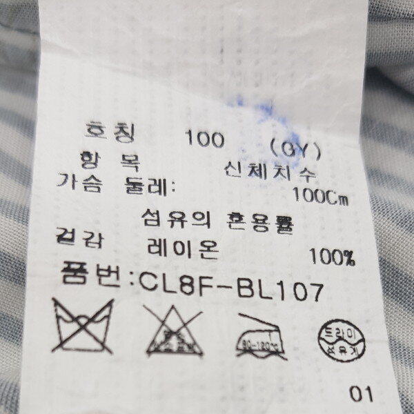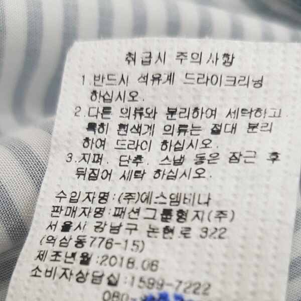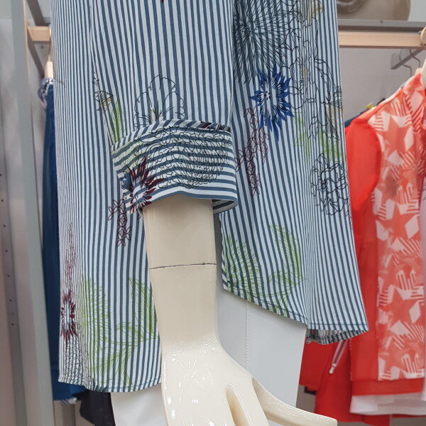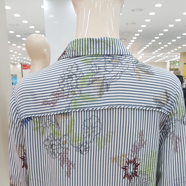 레이온 섬유를 사용하여 드레이프성이 뛰어나고 흡수성이 좋아 정전기가 덜 나는 소재로 스트라이프에 꽃 모티브를 올려 여성스럽게 풀어낸 셔츠형 블라우스.
