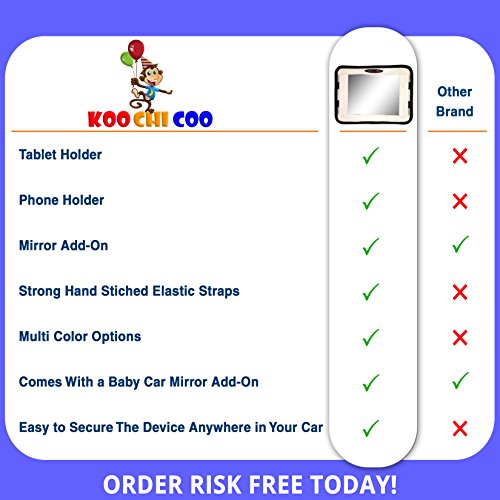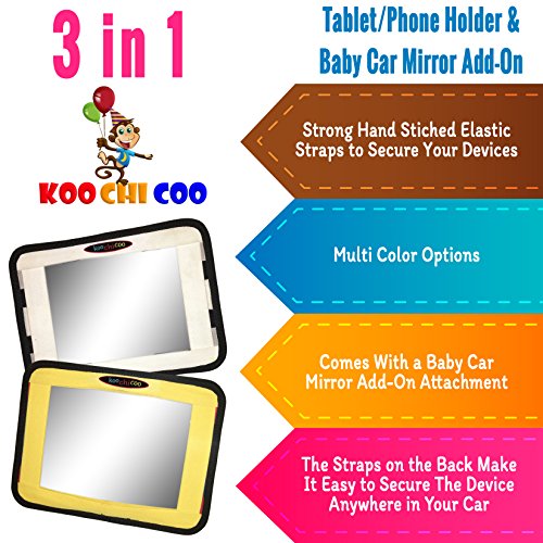Studio : koochicoo Publisher : koochicoo Binding : Baby Product Product Description --Koochicoo presents the VERY FIRST of its kind! The 'Koochicoo' 3 IN 1 TABLET HOLDER, PHONE HOLDER and BABY CAR MIRROR holder. It gives you peace of mind and makes your child's journey fun! It is THE tablet holder EVERY parent WANTS and NEEDS! Fun for all the family can can even be used by adults! -- SAFETY: As parents, we know safety is top priority. Children can get restless in the car and become a distraction for the driver. We believe our product can help you focus on the road by keeping your children entertained. -- An additional feature of this product is the baby mirror which can be used as a rear view car seat mirror. It uses a shatter-proof, light-weight material which is convex shaped for a wide angle view. -- Unlike other tablet holders which are made from hard and heavy plastic, Our unique Tablet holder is made from high quality elasticated fabric. Dual straps hold the tablet holder securely to head rest. The straps are adjustable to fit any size head rest or sun visor. -- This product is very easy to use so you can set off on your journey QUICKLY and STRESS FREE. --SIZE: The Tablet holder strap has been designed to hold the Apple Ipad air/air 2 (w 7.7", h 9.7"). It can also hold any tablet of a similar size such as the Samsung galaxy tab pro 10.1. The wide and tight straps give it flexibility. --The mini-pad straps will hold h 7.87" x w 5.3". The phone holder straps are designed to securely hold the iPhone 6 (5.44" x 2.64"). --Due to the wide and tight straps it can also hold other phones of similar and smaller sizes such as the samsung galaxy S6. -- If you have ANY problems with your 'Koochicoo' tablet holder contact our customer support team. DISCLAIMER: Instructions and size guides have been provided. Failure to follow specifications may result in safety hazard for your child, for which 'Koochicoo' holds no liability. 0 |