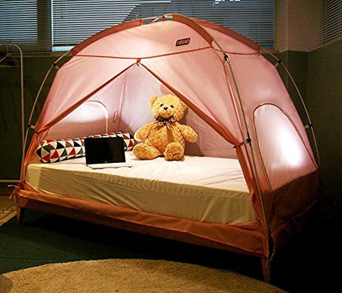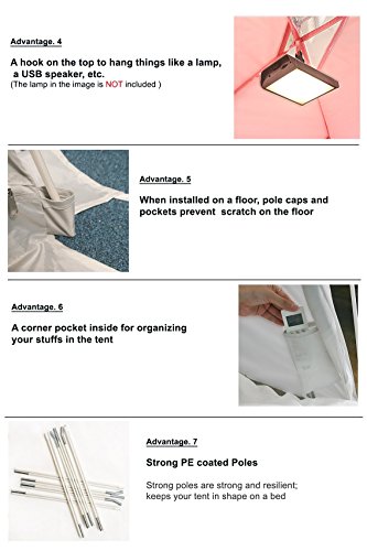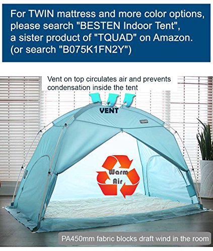 Stay toasty This floorless tent keeps warm air inside while facilitating ventilation through a mesh vent on top. Have some privacy here Great solution for kids and teenagers sharing a room with siblings, and students living in dorms. This tent gives you maximum privacy even when you have to share a room with others.? Storage pockets inside help you to get organized while enjoying the privacy. A Touch-friendly pocket for your favorite smart devices. You can lie down and watch movies from your tablet. Play tent Kid's fort Also Good for kid's play tent on a floor or a bed. Strong Durable PE pole Equipped with strong and durable PE wrapped FRP poles, this tent is very resilient?and keeps its shape. Please always remove poles first before folding the tent to store away. Otherwise, fabrics can be damaged by strong and elastic poles. Size options 'Small' fits Single, Super-Single, twin size mattresses. 'Medium' fits double, full, queen-size matresses. ? You may also want to check "BESTEN Indoor Tent" which is a new version of TQUAD?Indoor tent. This 2017 version has more color options and other modifications. Please search?"B075K7YYHF" or "BESTEN Indoor Tent" on Amazon. 0 |