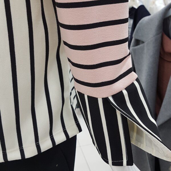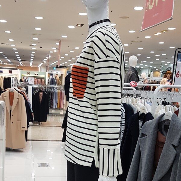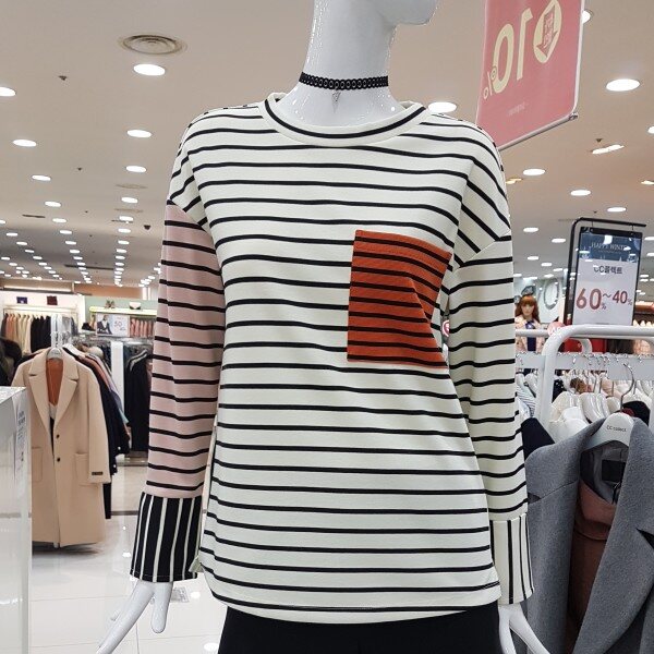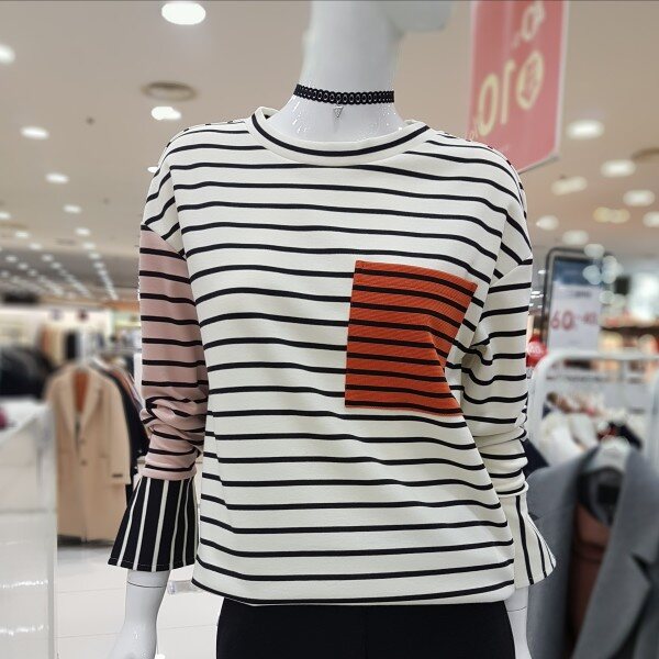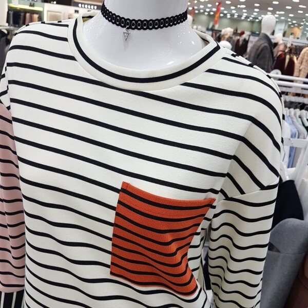 산뜻배색 아웃포켓에 티셔츠네요보들보들소재에 여유있는 사이즈는착용감 편하고 넘좋아요스트라이프에 소매언밸배색이상체통통 제가 날씬해보인답니다소매밑단트임에 독특한 디쟌이네용