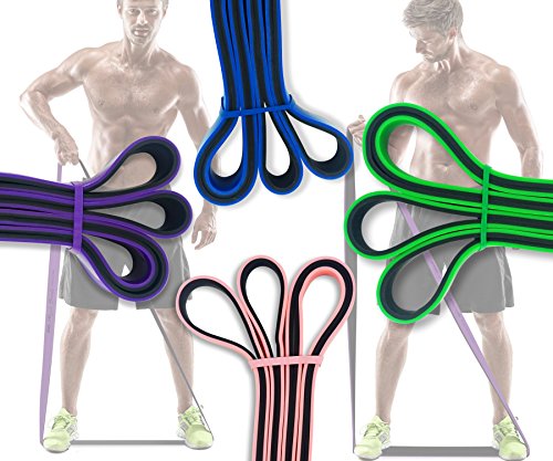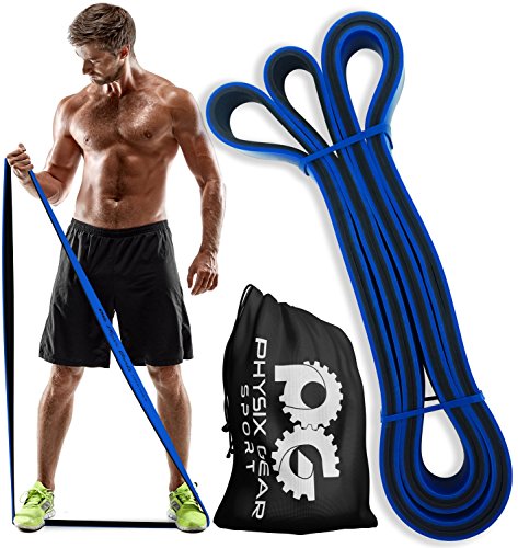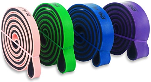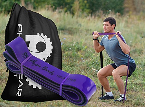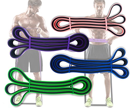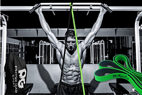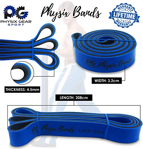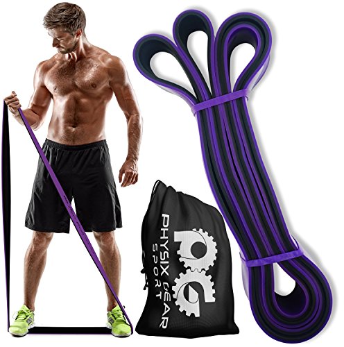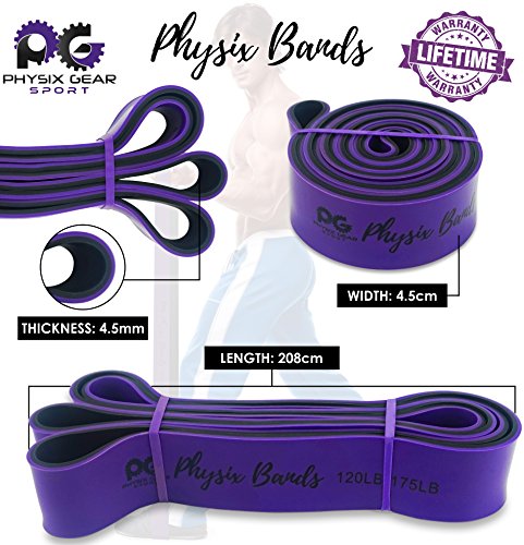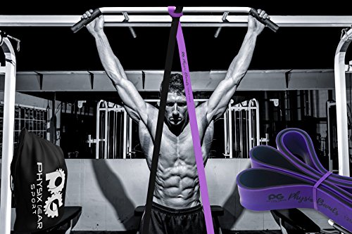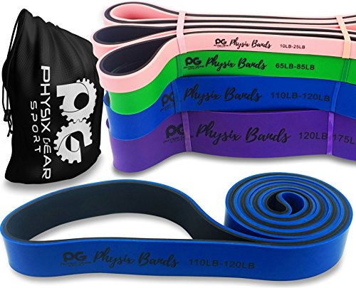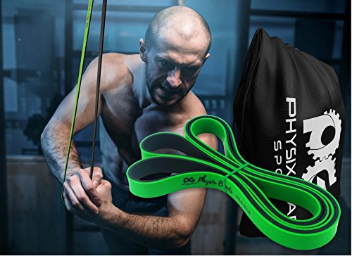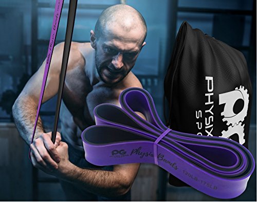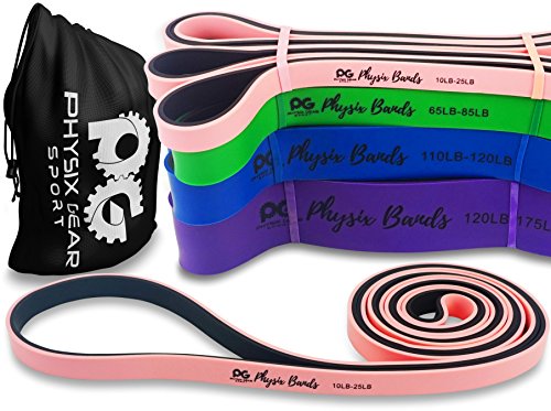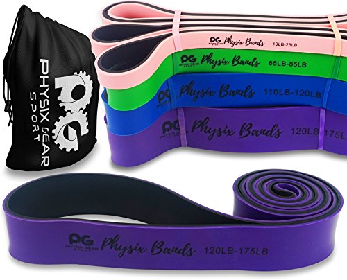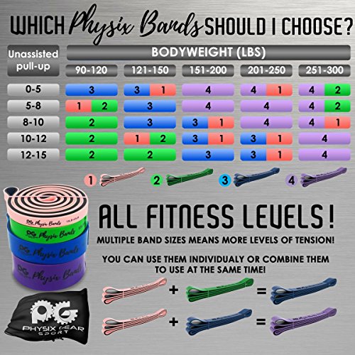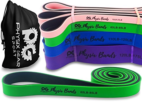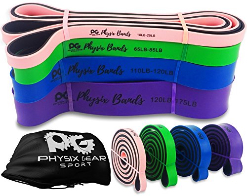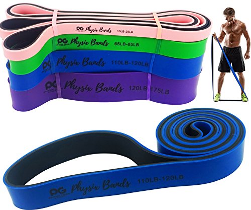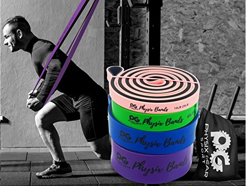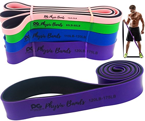 GET RESULTS WITH ALL NEW PHYSIX POWER BANDS Resistance Levels:? ? Pink/Black (Lightest) 10lbs-25lbs resistance (4.5kb ? 11kg) ? Green/Black (Medium) 65lbs-85lbs resistance (29kg ? 38.5kg) ? Blue/Black (Strong) 110lbs-120lbs resistance (49kg ? 54kg) ? Purple/Black (Strongest) 120lbs-175lbs resistance (54kg ? 79kChoosing the right band depends on your level of strength and weight. Please view our pull up and exercise guides in the photos section if you are unsure which band to purchase.g) ? Order comes with one single band or 4 Set.?If you would like to purchase multiple bands of the same size or of different sizes, simply add them to your basket before you checkout. ??Pull Ups?- Increase your strength and build muscle. ??Versatile?- Range of band sizes and exercise options for all muscle groups. ??Portable?- Use at home, in the gym or on the go. ??Highest Quality?- 100% natural latex. ??Physical Therapy?- Ideal for injury rehabilitation and improved mobility.