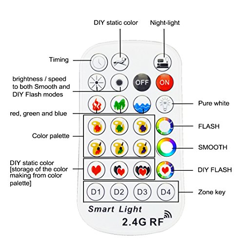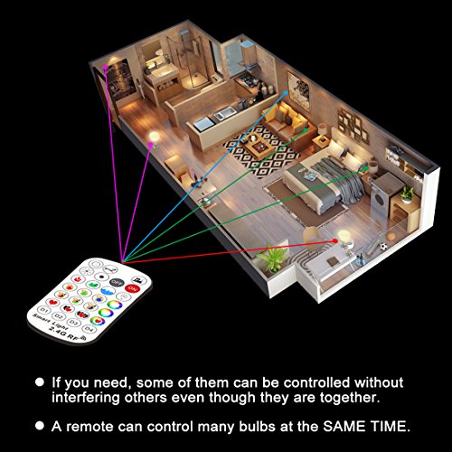 - 2.4G RF Remote Control : a remote can control many bulbs at the SAME TIME, remote control distance is 50 fts , angle is 360 degree, no alignment to lights . Including partition function, for example, a remote can control the lights in the lobby and the lights in the dining room respectively.