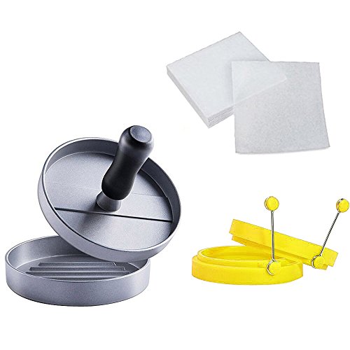 -. Feature : Fantastic Aluminum Hamburger Press --- ① A perfect help to make homemade burgers, It makes the work of creating equally sized and perfectly-shaped burgers easily and quickly. ② Be allowed to add whatever ingredients into the patty for personalized burgers, such as ground beef, fish, chicken, turkey or veggie patty. / Great Quality Material and Very Functional --- ① The press is made of food-grade aluminum die cast and is non stick which makes the cleaning very easy. ② The detachable handle is removable and brilliant for storage while not in use. ③ It has grooves on the top and bottom, which can keep the meat juices on top of the patty instead of rolling off while cooking. / Easy to Use and Clean --- ① With its non-stick food safe coating, the burger can be removed from the press easily. Just turn the press over and let the formed patty "fall" out. The operation is quite easy and safe, the kids also like helping out. ② Clean up is a breeze, because the press is dishwasher safe and non-stick. It only takes a minute or less to wash it clean. / Two Pieces Awesome Silicone Egg Ring --- ① They are made of food grade silicone so they are dishwasher safe, heat safe in temperatures up to 560°F and won't scratch the non-stick pans! ② Measurements are about 4 inches in diameter and about 0.75 inches deep. They are great for eggs, pancakes, biscuits, hash browns, and etc... / Free Durable Square Wax Papers --- As a bonus, the burger press set comes with 100 sheets of non stick wax paper. ① This wax paper can stop the burgers from getting stuck to the press and other patties as well. ② Put the paper between the burgers for storage to avoid freezing together.