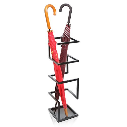 -. Feature : A metal umbrella rack featuring a black finish and a modern, geometric design. / The metal bar that forms the body of this stand starts at the square-shaped metal base and turns at right angles in different directions to create an artistic openwork shape. / Ideal for keeping long umbrellas safely stored, especially as they dry. / **Official MyGift® product.** / Approximate Dimensions (in inches): 7 W X 24.75 H X 7 D.
