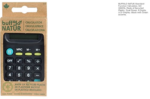 -. Binding : Office Product -. Brand : Buffalo Natur -. EAN : 0069762025850 -. Feature : be powered by batteries and / solar power Made of recycled plastic 8 digit -. Label : Buffalo Original Inc -. Manufacturer : Buffalo Original Inc -. Model : 2585 -. MPN : 2585 -. PackageQuantity : 1 -. PartNumber : 2585 -. ProductGroup : CE -. ProductTypeName : CALCULATOR -. Publisher : Buffalo Original Inc -. Studio : Buffalo Original Inc -. Title : BUFFALO NATUR Standard Function Calculator, GO GREEN, Made of Recycled Plastic. Dual Power. 8 Digits. LCD Display. Black with Green accents. -. UPC : 069762025850