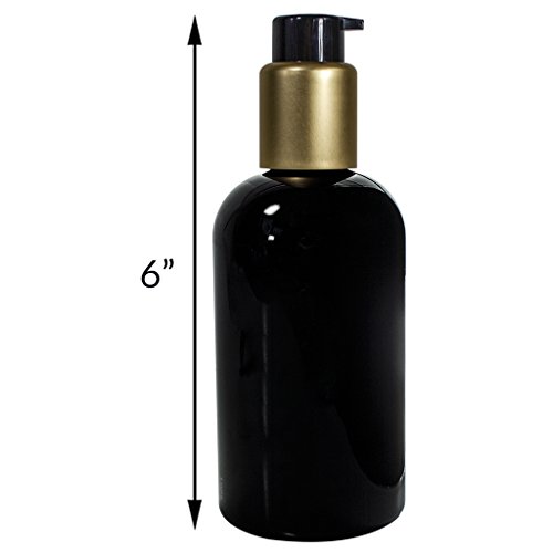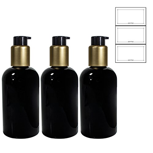 Includes 3 - Black 8 oz Boston Round Refillable PET (BPA Free) Plastic Bottle with Gold / Black Pump Top + 3 Labels
