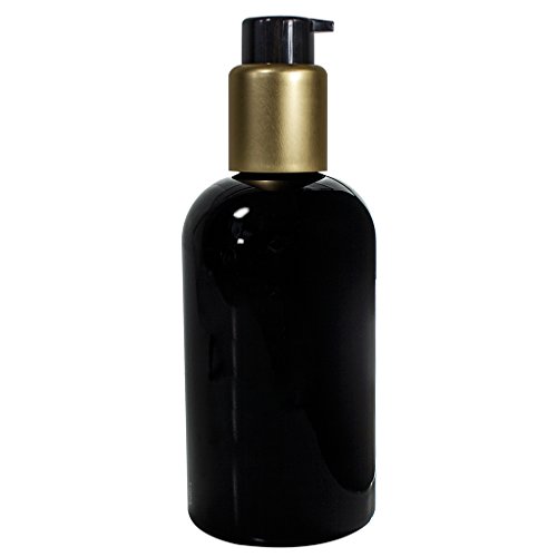 Black 8 oz Boston Round Refillable PET (BPA Free) Plastic Bottle with Gold / Black Pump Top (3 pack) + Labels