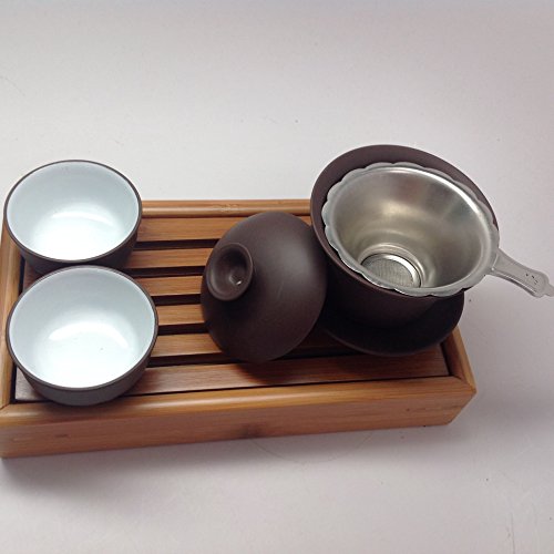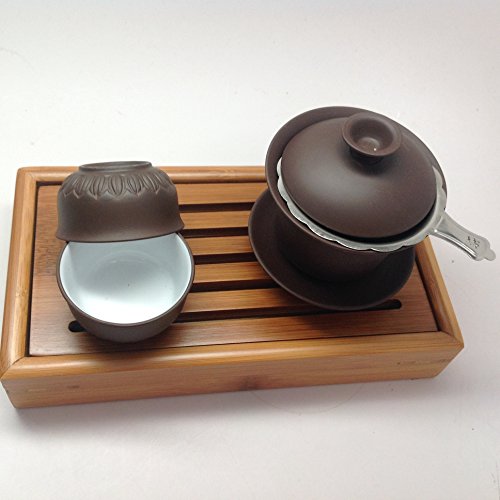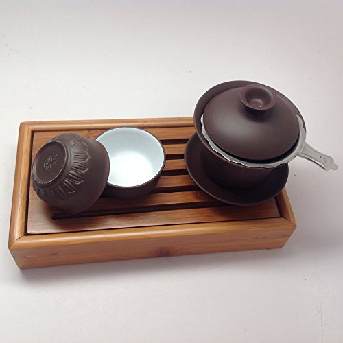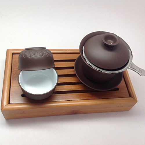 Product Description Gaiwan tea cup 4oz, with two cups with beautiful design lotus flower on cups 1oz capacity, with a larger stainer, and a bamboo mini tea tray like a I pad Mini Size, great set travel with it. 0