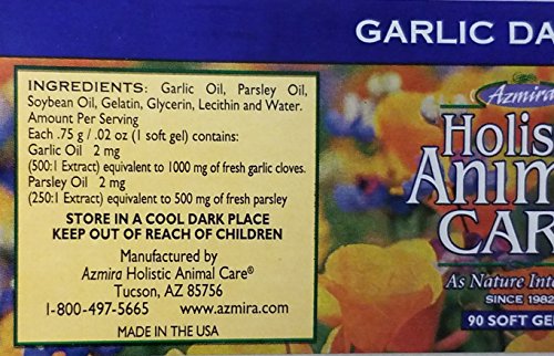 Azmira Holistic Animal Care's Garlic Daily Aid contains Garlic Oil (2mg - 500:1 Extract) and Parsley Oil (2mg - 250:1 Extract).