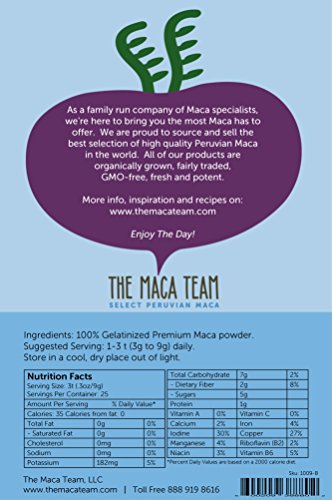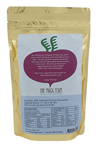 Our Premium Gelatinized Maca powder is made using a unique process. Instead of being sundried after harvest, the fresh roots are immediately cleaned, ground into a pulp and low temperature dried to produce a powder, which is then gelatinized to dissolve most starch content. This careful and quick handling preserves more vital nutrients of the Maca roots and makes for a significantly more potent product. Gelatinized Premium Maca is easier to digest than a Raw Maca powder making it suitable for the majority of people. It takes about 4 kg of Raw Maca roots to produce 1 Kg of Gelatinized Maca powder, making it more concentrated than Raw Maca. Our Premium Maca powder contains a combination of about 30% Red, 40% Yellow and 30% Black Maca roots. Given the special handling and combination of Maca colors, Premium Maca Powder is in our opinion the best all-purpose Maca for both Men and Women. Our Gelatinized Premium Maca is pre-cooked, certified organic and fairly traded. The Maca Team, LLC is dedicated to preserving and sharing high quality Peruvian grown Maca with the world. As a family run company of Maca specialists, we're here to bring you the most Maca has to offer. We are proud to source and sell the best selection of high quality Peruvian Maca in the world. All of our products are always organically grown, fairly traded, GMO-free, fresh and potent. We sell 8 different kinds of certified organic Maca, raw and gelatinized (pre-cooked), in a variety of sizes, in vegan capsules and extracts. Please see our seller profile for more details and links to our products. Thank you for considering The Maca Team. Enjoy your day!Feature