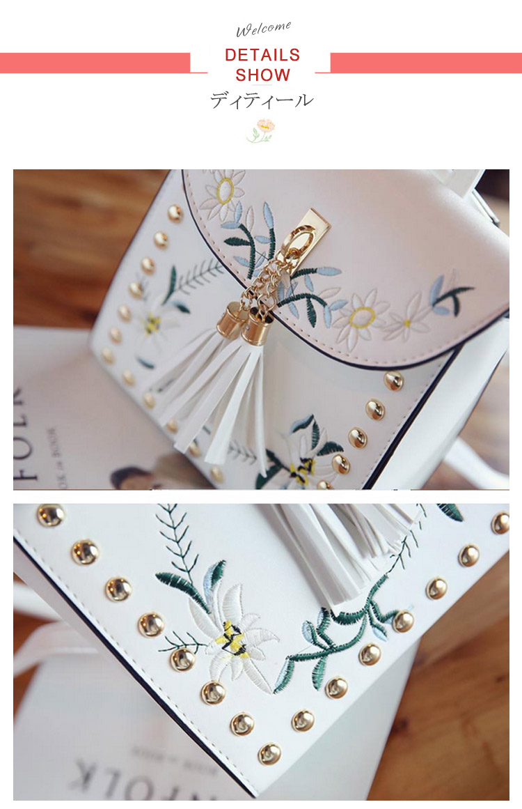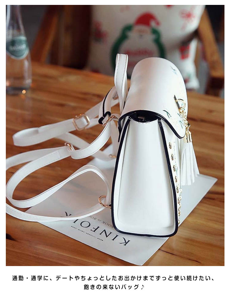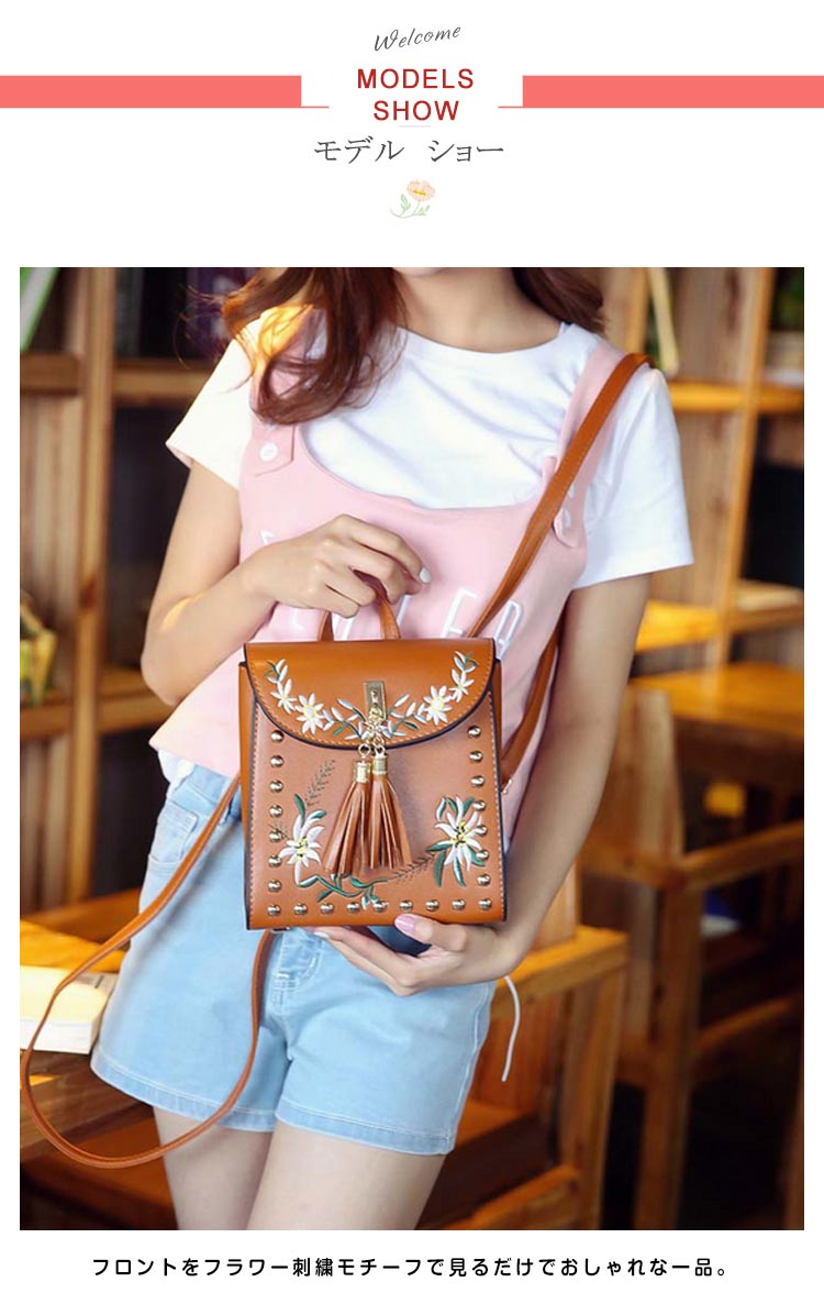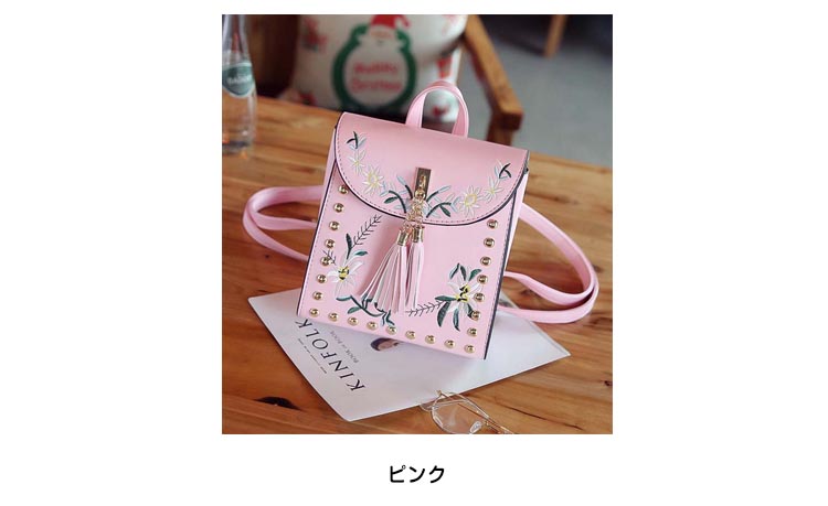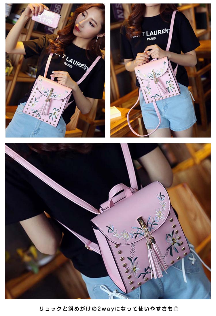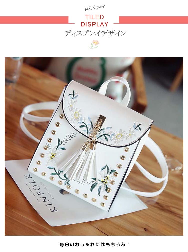 | おしゃれでかわいい女の子向け刺繍リュック!フロントをフラワー刺繍モチーフで見るだけでおしゃれな一品。金具とタッセルデザインも可愛いポイント。リュックと斜めがけの2wayになって使いやすさも◎小さめミニバッグでもお出掛けに必要な物は入る見た目以上の収納力!!毎日のおしゃれにはもちろん!通勤・通学に、デートやちょっとしたお出かけまでずっと使い続けたい、飽きの来ないバッグ♪ | |