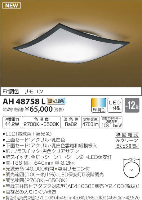 ●調色時定格光束値:2700K時(4545lm・45.6W)/6500K時(4560lm・42.6W)