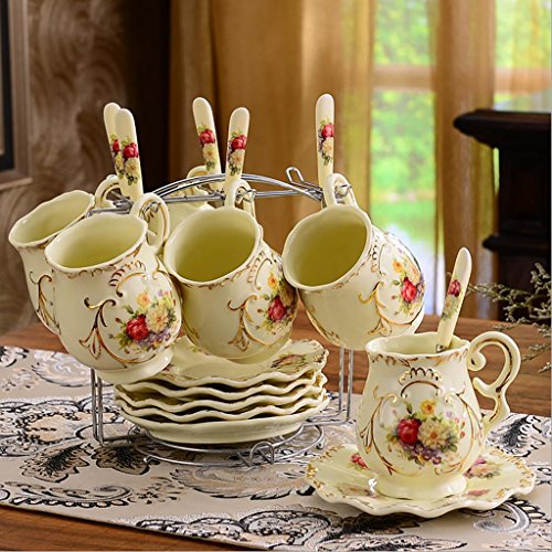 -. Feature : Material: ceramic / Size: saucer diameter 15cm, Cup-caliber 10cm, high 11.5cm / Containing 6 cups, 6 saucers, 6 spoons, a stainless steel shelf / Tea or coffee is a good choice / Can be used as a gift
