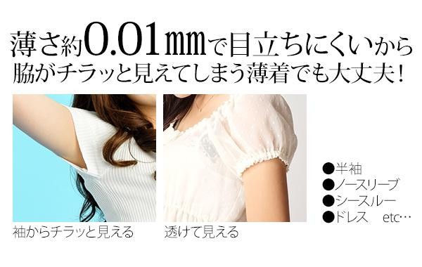 Ag配合で抗菌、ニオイを防ぎ、貼っていることを忘れるほどの薄さ0.01mmの極薄シート。テカリを抑えたマット加工の透明シートで、ノースリーブでも目立たない。誰でも簡単に貼りやすい楕円形カット採用。 |
