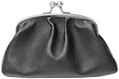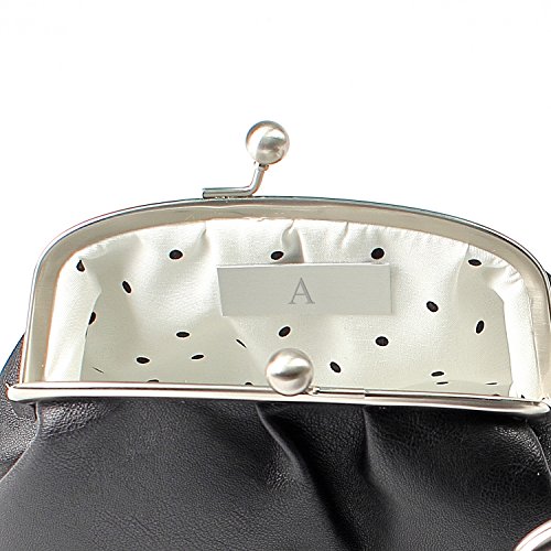 Clutch features snap-top closure, polka dot print lining, and "survival kit"