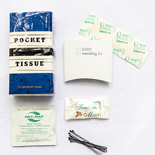 "Survival Kit" contains: 2 band aids, 4 bobby pins, towelette, matchbox sewing kit, breath mint, and travel Kleenex pack