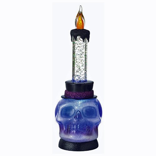 -. Feature : Our ghoulish skeleton supports a candle filled with silvery glitter that sparkles & shimmers / Measures 3" x 3" x 8"H. Acrylic and Battery Operated. / Takes 1-CR2032 battery (not included)