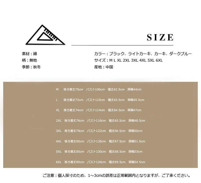 マウンテンパーカー メンズ ジャケット メンズ ショート丈 無地 大きいサイズ ゆったり 春コート トップス 撥水 アウトドア 2018新作登場 マウンテンパーカー メンズ 大きいサイズ 春コート トップス商品詳細素材:綿柄:無地季節:秋冬カラー:ブラック、ライトカーキ、カーキ、カーキ、ダークブルーサイズ:M L XL 2XL 3XL 4XL 5XL 6XL産地:中国サイズ参照表M 後ろ着丈70cm バスト106cm 袖丈62.5cm 肩幅44cmL 後ろ着丈72cm バスト110cm 袖丈63.5cm 肩幅45.5cmXL 後ろ着丈74cm バスト114cm 袖丈64.5cm 肩幅47cm2XL 後ろ着丈76cm バスト118cm 袖丈65.5cm 肩幅48.5cm3XL 後ろ着丈78cm バスト122cm 袖丈66.5cm 肩幅50cm4XL 後ろ着丈80cm バスト126cm 袖丈67.5cm 肩幅51.5cm5XL 後ろ着丈80cm バスト130cm 袖丈68.5cm 肩幅53cm6XL 後ろ着丈80cm バスト134cm 袖丈69.5cm 肩幅54.5cmご注意:個人採寸のため、1~3cmの誤差は正常範囲内となりますが、ご了承ください。マウンテンパーカー メンズ ジャケット メンズ ショート丈 無地 大きいサイズ ゆったり 春コート トップス 撥水 アウトドア 2018新作登場 マウンテンパーカー メンズ 大きいサイズ 春コート トップス