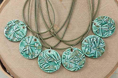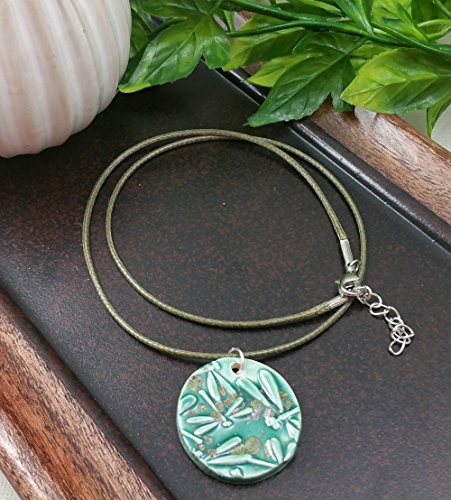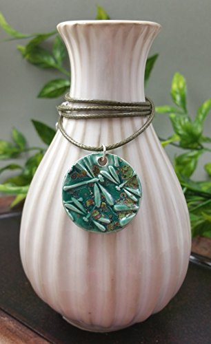 A hand formed dragon fly pendant made of ceramic clay. On the back of the pendant I have left a penny size exposed unglazed section of the porous clay, simply add a drop of your favorite essential oil, fragrance or perfume. Included is a matching 18 inch waxed cotton necklace, with a 2 inch extender chain. Each ceramic piece is fired to over 2000 degrees multiple times to achieve the finished look. The pendant is 1 1/8" round. Using this necklace with aromatherapy oils is optional. Shipped in a gift box. The necklace pictured is one of six necklaces chosen at random. Sold as ONE necklace. Please send me a message if you have any questions. Thanks, Elizabeth