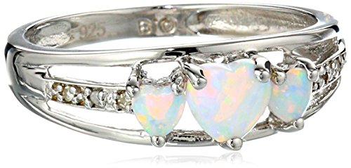 This sterling silver ring features 3 majestic heart shaped lab created milky white opal gemstones standing proudly atop the triple split shank. Dazzling diamond accents grace the shank, giving the ring just a hint of extra sparkle.Feature