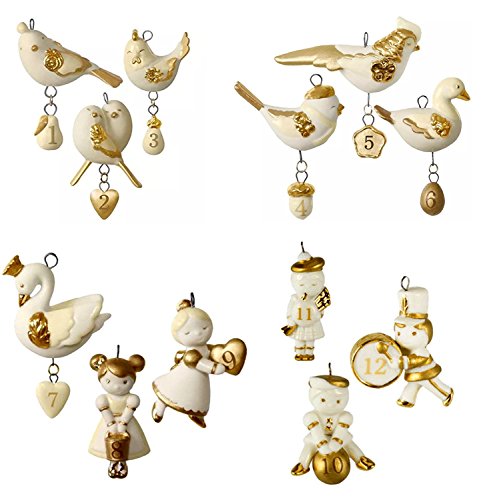 - INCLUDES ALL 4 2016 SETS - 12 Ornaments in all. Set one includes a partridge in a pear tree, a turtle dove and a calling bird. Set two includes a french hen, a bird carrying a golden ring and a goose a laying. Set three includes a swan a swimming, a maid a milking and a lady dancing. The final set includes a lord a leaping, a piper piping and a drummer drumming.