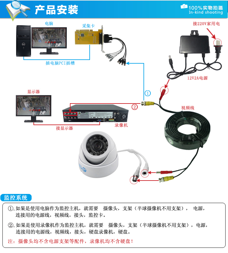 自带监控摄像机标准电源、BNC连接头,可以直接连接监控摄像机和采集卡、硬盘录像机。