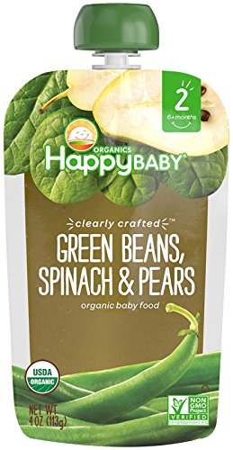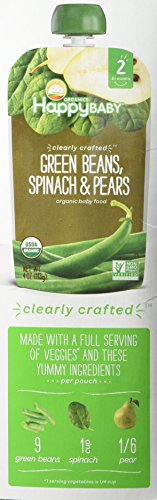 -. Binding : Grocery -. Brand : Happy Family -. EAN : 0819573013566 -. Feature : New clear packaging so you can see what you're feeding your baby; 16 pouches of 4.0oz puree / Recipe made with wholesome organic fruit and vegetable purees for vibrant flavor you can see and taste / Developed for babies aged 6 months+, but great for any little one exploring the world of solid foods / Certified USDA Organic; Non-GMO Project Verified; Gluten Free; Kosher; No added sugars or artificial flavors -. Label : Happy Baby - Quidsi -. Manufacturer : Happy Baby - Quidsi -. MPN : 01364 -. NumberOfItems : 1 -. PackageQuantity : 1 -. PartNumber : 01364 -. ProductGroup : Grocery -. ProductTypeName : GROCERY -. PublicationDate : 2016-07-08 -. Publisher : Happy Baby - Quidsi -. ReleaseDate : 2016-07-08 -. Studio : Happy Baby - Quidsi -. Title : Happy Family Baby Clearly Crafted Stage 2 Green Beans, Pears & Spinach, 8 Count -. UPC : 819573013566