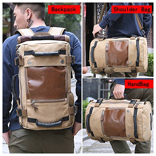 -. Feature : Dimension: Approx.30 x 18 x 48 cm / 11.8 x 7 x 18.9 inch(L x W x H). It can fits most 15.6 inch laptop. / Structure: 1 main zippered pocket, 1 laptop compartment in main pocket, 2 zipper pockets in front and 1 side mesh pocket. / Material: Made of 90% High density cotton canvas 10% PU leather, it's a durable backpack / Multi-purpose: This bag can used as camping bag / handbag / suitcase / brief case when travelling. The side handle can make the bag as handle bag; Two durable straps are in a hidden compartment to make the bag as backpack; One additional shoulder strap can easily turn the backpack into a messenger bag / crossbody bag. One bag offers three different ways of carrying / Awesome designed: make full use of the bag storage space, high-density cotton shoulder strap and comfort at the same time let the backpack more attractive.