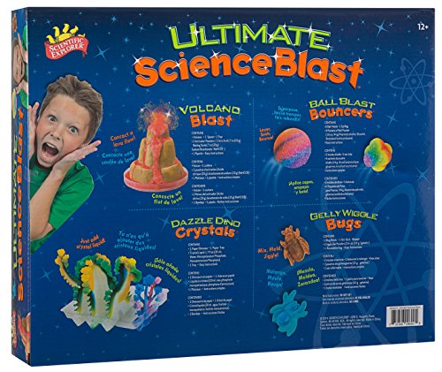 Scientific Explorer Ultimate Science Blast is 4 popular kits in one set. Concoct a lava flow with Volcano Blast! Mix, mold and jiggle Gelly Wiggle Bugs! Just add crystal liquid to create Dazzle Dino Crystals! Layer, soak and bounce Ball Blast Bouncers! The kits include Ball Blast Bouncers: 3 ball molds, 9 packets of ball powder (0.4 oz. polyvinyl alcohol, glycerin, butylated hydroxytoluene) and easy instructions; Gelly Wiggle Bugs: 2 bug molds, 1 stir stick, beaker, 3 jiggly gel powder (0.53 oz. gelatin), laminated paper and easy instructions; Dazzle Dino Crystals: 1 paper dinosaur, 2 paper trees, crystal liquid (0.7 oz. water, monopotassium phosphate, monoammonium phosphate) 2 trays Volcano Blast: 2 Dinosaurs (2 in.), volcano (4.5 in.), 1 spoon, 2 activator powders (1.4 oz. citric acid, baking soda (sodium bicarbonate), 1 pipette and easy instructions for each set.Feature