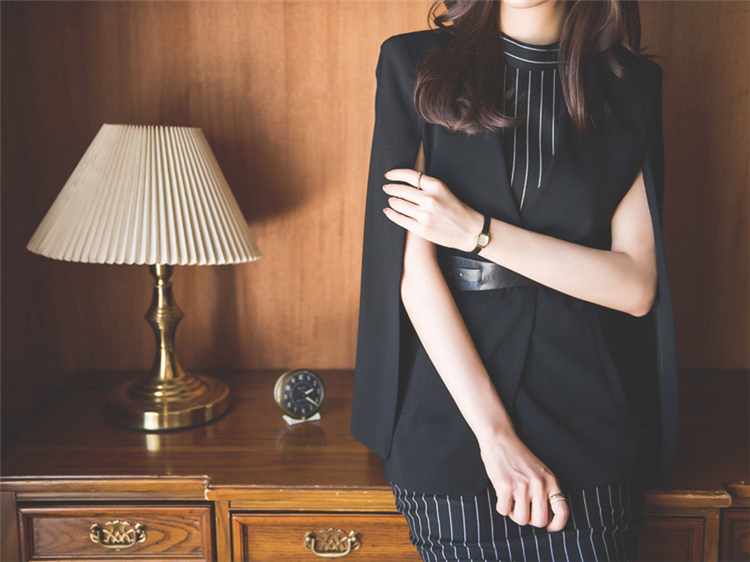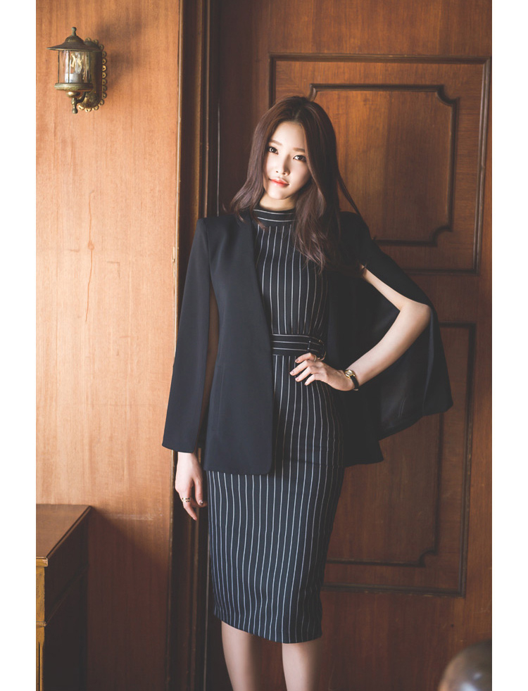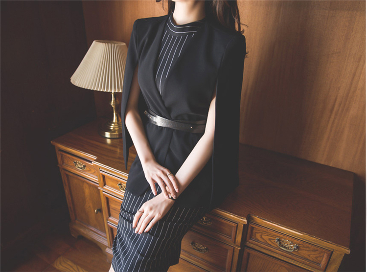 ブラック×ホワイトのストライプワンピースとマント風のケープのセットアップです。