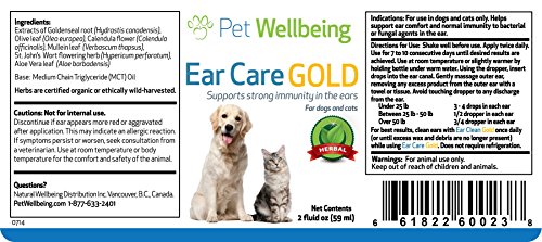 -. Binding : Misc. -. Brand : Pet Wellbeing -. EAN : 0661822600238 -. Feature : This formula is entirely prepared with herbs that are certified organic, ethically wild-harvested or selectively imported if domestic sources are not available. We only buy from trusted growers. Tested for purity. / Helps with bad ear odor / Encourages natural immunity / Ear Care Gold is a natural solution to strengthening immunity in feline ears. The ingredients in Ear Care Gold provide an inhospitable environment to bacteria and fungi, yet are gentle and soothing to the ears. / Restores calm and comfort to your cat once discomfort resolves -. Label : Pet Wellbeing -. Manufacturer : Pet Wellbeing -. MPN : PW 0023-B -. PackageQuantity : 1 -. PartNumber : PW 0023-B -. ProductGroup : Pet Products -. ProductTypeName : PET_SUPPLIES -. Publisher : Pet Wellbeing -. Studio : Pet Wellbeing -. Title : Pet Wellbeing - Ear Care Gold for Cats - Natural Immune Support for Feline Ears - 2oz (59ml) -. UPC : 661822600238