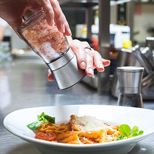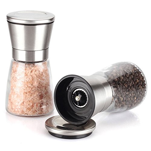 Pepper and Salt Mill Set(2pcs)Brushed Stainless Steel Upper Part with Glass Body with Adjustable Ceramic Grinder-Premium Pair of Salt & Peppercorn Grinders.