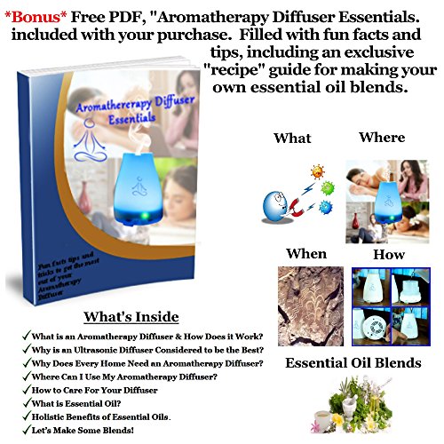- ★ BONUS - FREE PDF "AROMATHERAPY DIFFUSER ESSENTIALS" - This great little info graphic is filled with fun facts and tips to help you get the most out of your new aromatherapy diffuser. Get the what, where, when and how of aromatherapy diffusers. *PLUS* our exclusive "Essential Oil Recipe Guide" for creating your own essential oil blends!