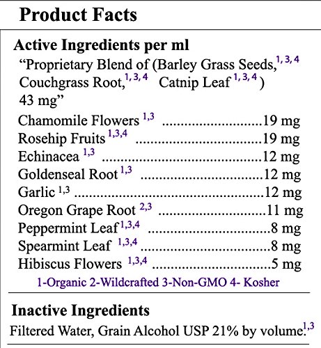 -. Feature : Kitty Distempaid Contains: Peppermint, Spearmint, Chamomile, Barley, Echinacea, Oregon Grape, Couch Grass, Rose Hips, Garlic, Golden Seal, Hibiscus, Cat Mint Leaf, Ethyl Alcohol, Filtered Water. / CAUTION: Do not give Kitty Distempaid to animals that are pregnant, have pancreas or liver disease. As with any product allergic reactions may occur.