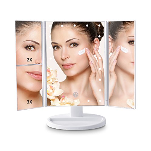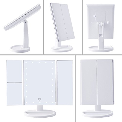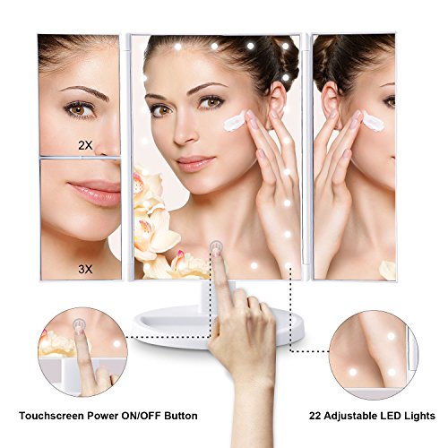 AVAWO Vanity Makeup Mirror Trifold 22 Led Lighted with Touch Screen, 1x/2x/3x Magnification and Usb Charging, 180° Adjustable Stand for Countertop Cosmetic Makeup