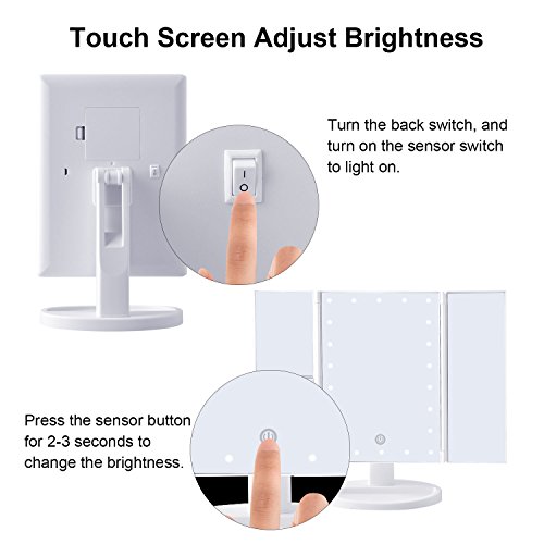 22 PIECES LED LIGHT: Our Vanity mirror is built-in 22 pieces adjustable Leds,allow you makeup in the dark or poorly lit areas.LED lights brightness adjust by the touch sensor switch.