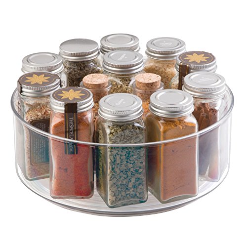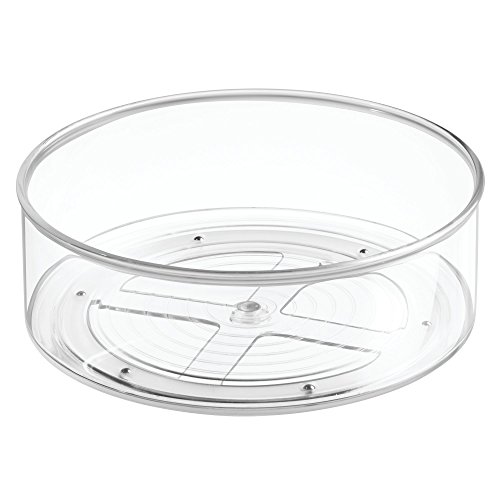 Product Description The mDesign Lazy Susan Turntable is a fantastic storage option to make your cabinets and pantry not only visible but accessible. The clear walls allow you to see what you have, how much and where your cooking spices and oils are, instantly. The base rotates 360 degrees in a full circle. 0