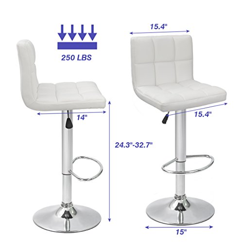 -. Brand : Devoko -. Feature : ★Modern and stylish design with PU leather cover bring you a comfortable sitting experience / ★With a built in 360° swivel function, give users the freedom of movement and able to carry conversations in any direction / ★Features a sturdy chromed base and pneumatic gas mechanism lift with footrest that Easily adjusts from counter to bar height / ★Load capacity: 250 LBS, Seating area Dimension: 16.5" x 15" (W X D), Back rest height: 12.8"; Adjustable seat height: 23.6"-31.5": Chrome base diameter 15" / ★Warranty: Within 30 days: Devoko is offering free replacement or refund for clients who not satisfy with any quality problems; Within 6 months: Free replacement for damaged/defective parts -. Label : Devoko -. Manufacturer : Devoko -. ProductGroup : Furniture -. ProductTypeName : HOME_FURNITURE_AND_DECOR -. Publisher : Devoko -. Studio : Devoko -. Title : Devoko White Bonded Leather Bar Stool Adjustable Hydraulic Barstools, Counter Swivel Barstool Set of 2