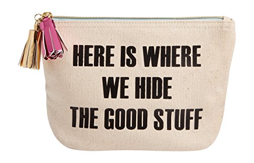 Product DescriptionCanvas pouch with here is where we hide the good stuff graphic. Fabric and care: imported man made materials wipe clean0