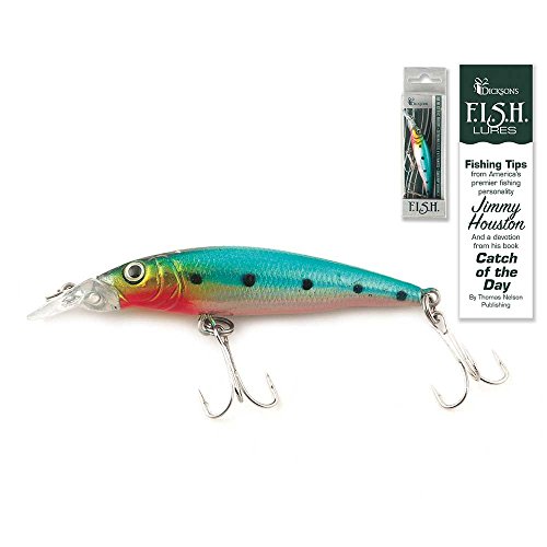 -. Binding : Misc. -. Brand : Dicksons -. Color : Aqua Parrot -. EAN : 0603799555784 -. Feature : Made of high quality lure materials and with metal treble hooks / Approximately 3 inch fishing lure; Designed for shallow cover diving and replicates a small perch with natural colors / Includes card with fishing tips and its own devotional / F.I.S.H. Find, Invite, Share and Help; Great for lakes ponds and rivers / Ships in protective packaging -. Label : Dicksons -. Manufacturer : Dicksons -. MPN : FL-3 -. PackageQuantity : 1 -. PartNumber : FL-3 -. ProductGroup : Sports -. ProductTypeName : SPORTING_GOODS -. Publisher : Dicksons -. Size : 3 x 3 -. Studio : Dicksons -. Title : Aqua Spotted Parrot Shallow Diver 2.8 Inch Hard Bait Fishing Bait Lure -. UPC : 603799555784