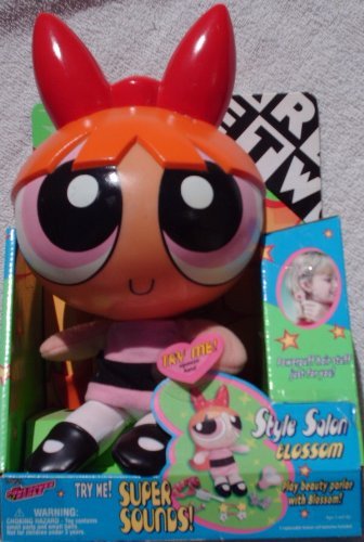 -. Feature : The Powerpuff Girls Talking STYLE SALON BLOSSOM 10 inches tall Plush body w/plastic head Doll. / Blossom Talks, super sounds. Play beauty palor with Blossom! / Blossom play pal includes; 2 flower clips, 2 heart bobby pins, 2 hair bands, / 1 scrunchie, 1 mirror, removable dress, tights and shoes. / Made by trendmasters in 2000 and long out of production. Requires 3 button cell batteries.