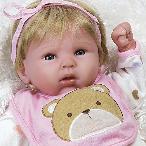 -. Binding : Baby Product -. Brand : Paradise Galleries -. Department : unisex-child -. EAN : 0010475421217 -. Feature : REALISTIC DOLL: Amazingly lifelike and realistic 19 inch baby doll sculpted by artist Michelle Fagan / SCULPTED GENTLETOUCH VINYL: Happy Teddy was sculpted so realistically in baby soft GentleTouch vinyl to look and feel just like a real baby / WEIGHTED: She comes with a weighted soft cloth body for the most lifelike feel when you cuddle her / ROCK A BYE BABY MUSICAL BIB: Happy Teddy is ready to serenade you with "Rock-a-Bye Baby" when you press the musical chip in her bib / CRAFTED TO PERFECTION: She has beautiful hand set darling blue eyes, hand painted details, hand applied eyelashes and beautiful blonde hair -. IsAdultProduct : 0 -. IsAutographed : 0 -. Label : Paradise Galleries -. Manufacturer : Paradise Galleries -. Model : 21002100 -. MPN : 21002100 -. PackageQuantity : 1 -. PartNumber : 21002100 -. ProductGroup : Toy -. ProductTypeName : HOME_FURNITURE_AND_DECOR -. Publisher : Paradise Galleries -. Studio : Paradise Galleries -. Title : Paradise Galleries 19 inch Baby Doll That Looks Realistic & Lifelike Baby Doll, Happy Teddy, Baby Soft Vinyl GIFT For Ages 3+ -. UPC : 010475221008