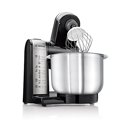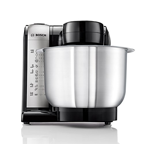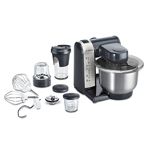 -. Feature : Praktischer Alleskönner mit großer Rührschüssel aus Edelstahl (3,9l, max. Teigmenge 2,0 kg) / Vielseitig einsetzbar mit Patisserie-Set (Schlagbesen, Rührbesen, Knethaken) und kompaktem Multi-Zerkleinerer-Set mit 5 Funktionen: Mühle, Universalzerkleinerer, Mixer sowie praktische Aufbewahrungs- und ToGo-Lösung. / Dynamisches 3-D Rührsystem MultiMotion Drive für optimales Vermengen der Zutaten. / Individuell erweiterbar mit einer Vielzahl an hochwertigem Zubehör sofern noch nicht im Lieferumfang enthalten z.B. Eisbereiter, Getreidemühle, Multimixer, SP.R.Itzgebäckvorsatz, Fleischwolf, Mixer, u.v.m. / Einfach und sicher zu bedienen (Bosch Technik); leicht zu reinigen (Spülmaschinen geeignetes Zubehör) / Lieferumfang: 1 x Rühr-/Schlagbesen, 1 x Deckel, 1 x Edelstahl-Rührschüssel, 1 x Knethaken Metall, 1 x Zubehörtasche dunkelgrau, 2 x Messer-Schutzkappe, 2 x Glas mit Aufbewahrungsdeckel, 1 x ToGo Mix-/Trinkbecher, 1 x Hack-/Mixmesser, 1 x Mahlmesser