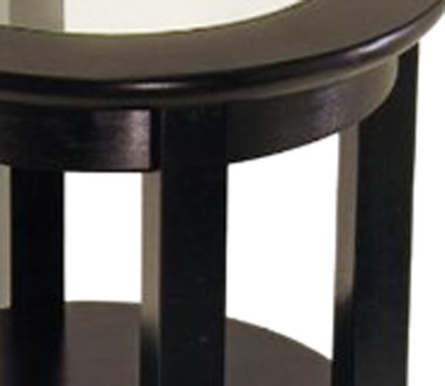 -. Feature : Round end table from Winsome Wood for living room or bedside use / Wood construction with dark espresso finish; clear glass tabletop / Stylish flared legs support table; lower shelf for storage or decorative display / Home assembly required; matching 2-shelf end table and coffee table available for separate purchase / Measures 18-1/2 inches wide by 18-1/2 inches deep by 22-1/2 inches high; 17 pounds upon shipping