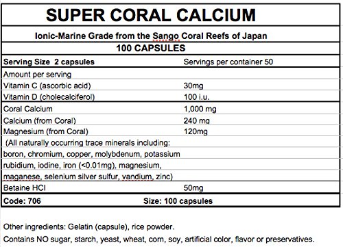 Ionic-Marine Grade Calcium from the fossilized Sango Coral Reefs of Japan. Super Coral Calcium is ecologically mined from the famous Sango Coral Reefs of Japan and contains ALKALINE minerals such as calcium, magnesium and other essential trace minerals in their natural ratio and ionic form. Our special Marine Grade (ocean bed) Coral Calcium is ground to only 8 microns! To further enhance the SUPER CORAL CALCIUM, we add Vitamins C and D, as well as Betaine HCI all necessary for absorption.Feature