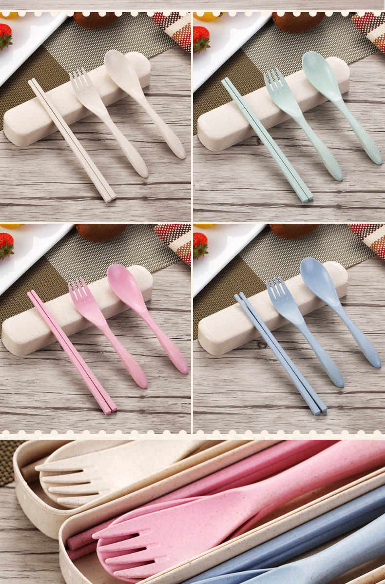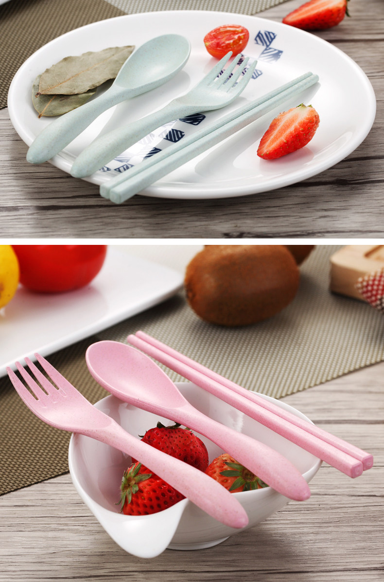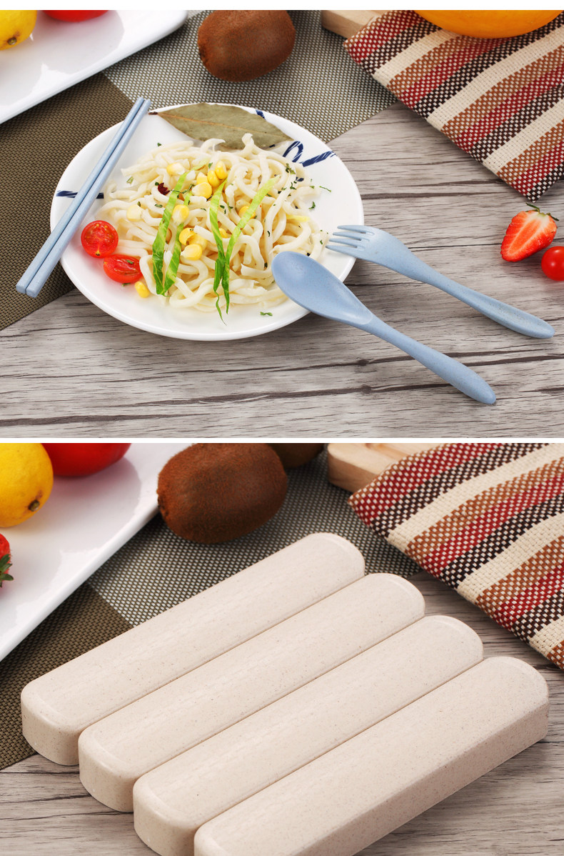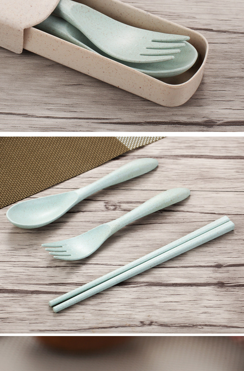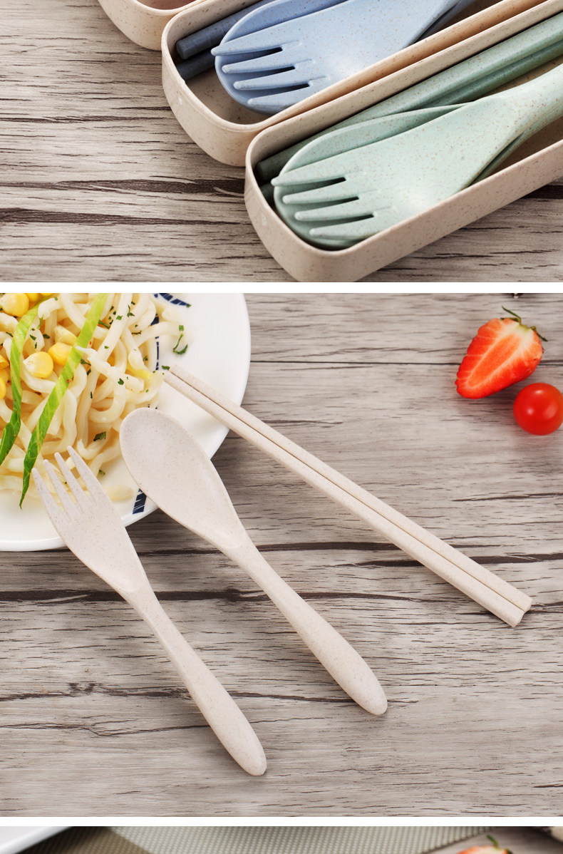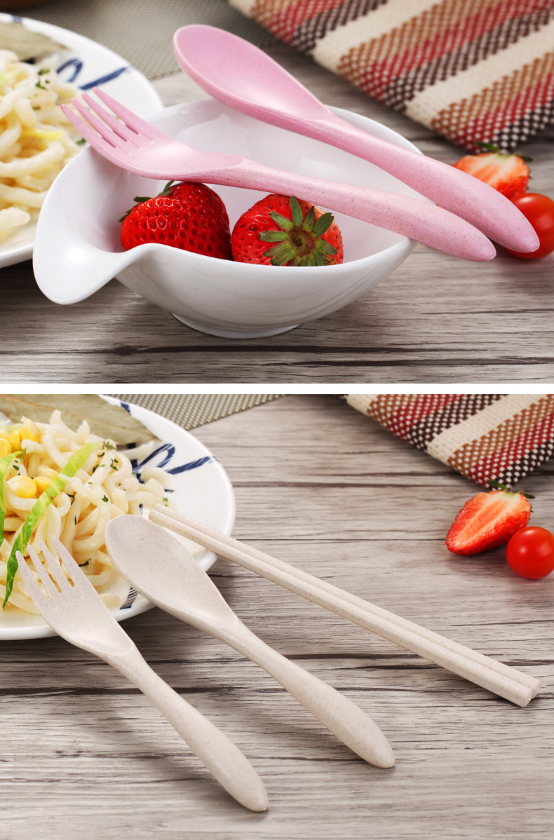 小麦秸秆便携餐具三件套勺子筷子叉子套装盒长柄家用学生创意可爱