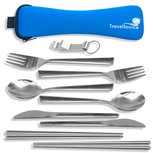 TravelSource - 2-person Stainless-Steel Camping Eating Utensils Kit + Case With Backpack Hanging Strap, Chopsticks & Bottle Opener