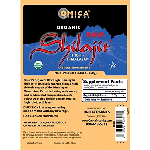 -. Binding : Health and Beauty -. Brand : Omica Organics -. Feature : Wild crafted and Certified Kosher / Naturally High Concentration of Fulvic Acid over 50% (Highest on the Market) / Abundant in Trace Minerals and Amino Acids; Supports Energy Production in the Body / Low Heat, Solvent-Free Extraction (below 96°F); Not Irradiated. / Harvested in a Controlled, ProP.R.Ietary Area Above 8,000 ft. in the High Indian Himalayas -. IsAdultProduct : 0 -. Label : Omica Organics -. Manufacturer : Omica Organics -. MPN : 397 -. PackageQuantity : 1 -. PartNumber : 397 -. ProductGroup : Health and Beauty -. ProductTypeName : HEALTH_PERSONAL_CARE -. Publisher : Omica Organics -. Studio : Omica Organics -. Title : High Himalayan Shilajit 250 g (8.8 oz)